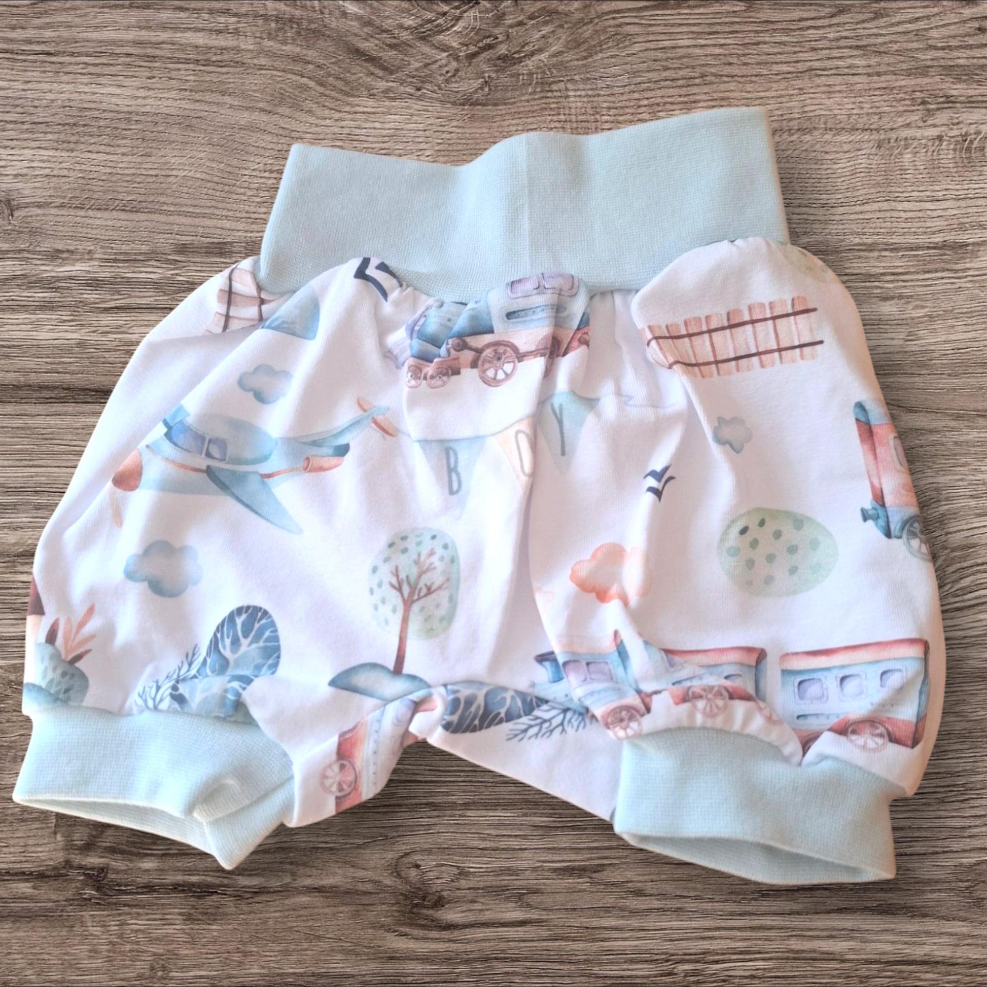 Größe 68/74 kurze Pumphose, Boy, Zug, Lokomotive, hellblau